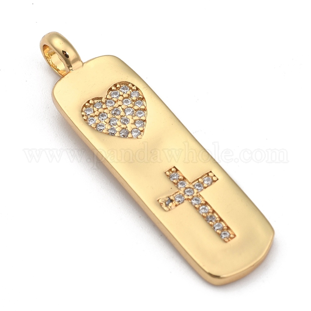 • Настоящее золото 18K Латунные микропаве прозрачные подвески с фианитом, долговечный, прямоугольник с сердцем и крестом, реальный 18 k позолоченный, 32x8.5x1.5 мм, отверстие : 3 мм