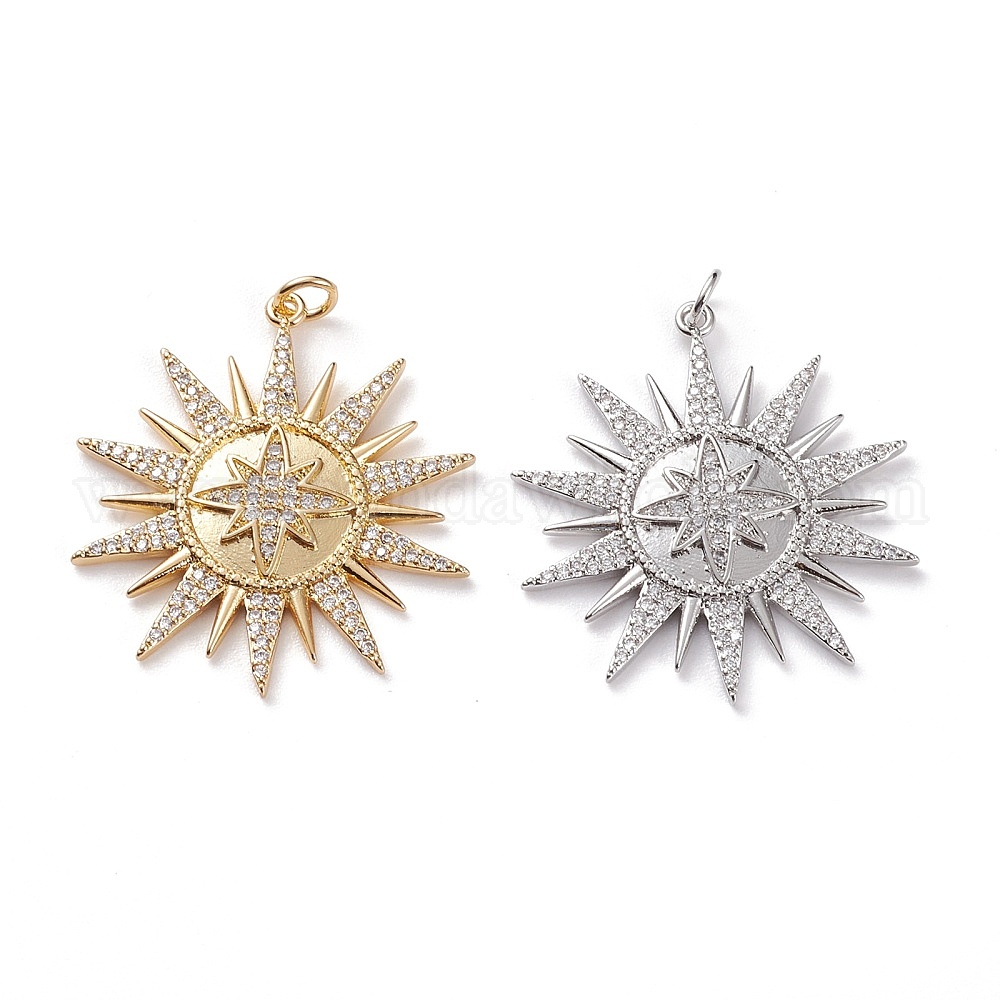 • Настоящее золото 18K Латунные микропаве прозрачные подвески с фианитом, с прыжковых колец, звезда, реальный 18 k позолоченный, 34x32x3 мм, Перейти кольцо: 5x1 мм, 3 мм внутренним диаметром