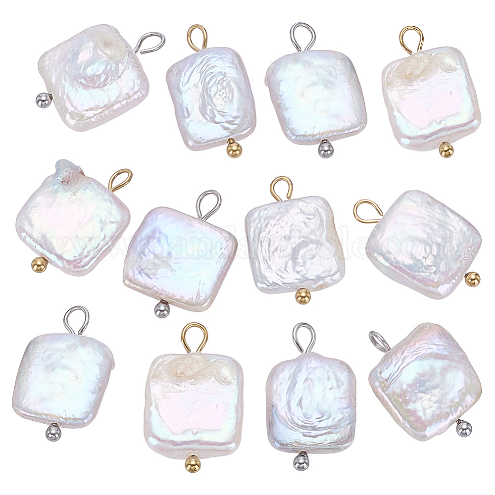 12шт. 2 цвета, подвески из натурального пресноводного жемчуга кеши, квадратных амулеты, с 304 петлями из нержавеющей стали, белые (0378QJ)