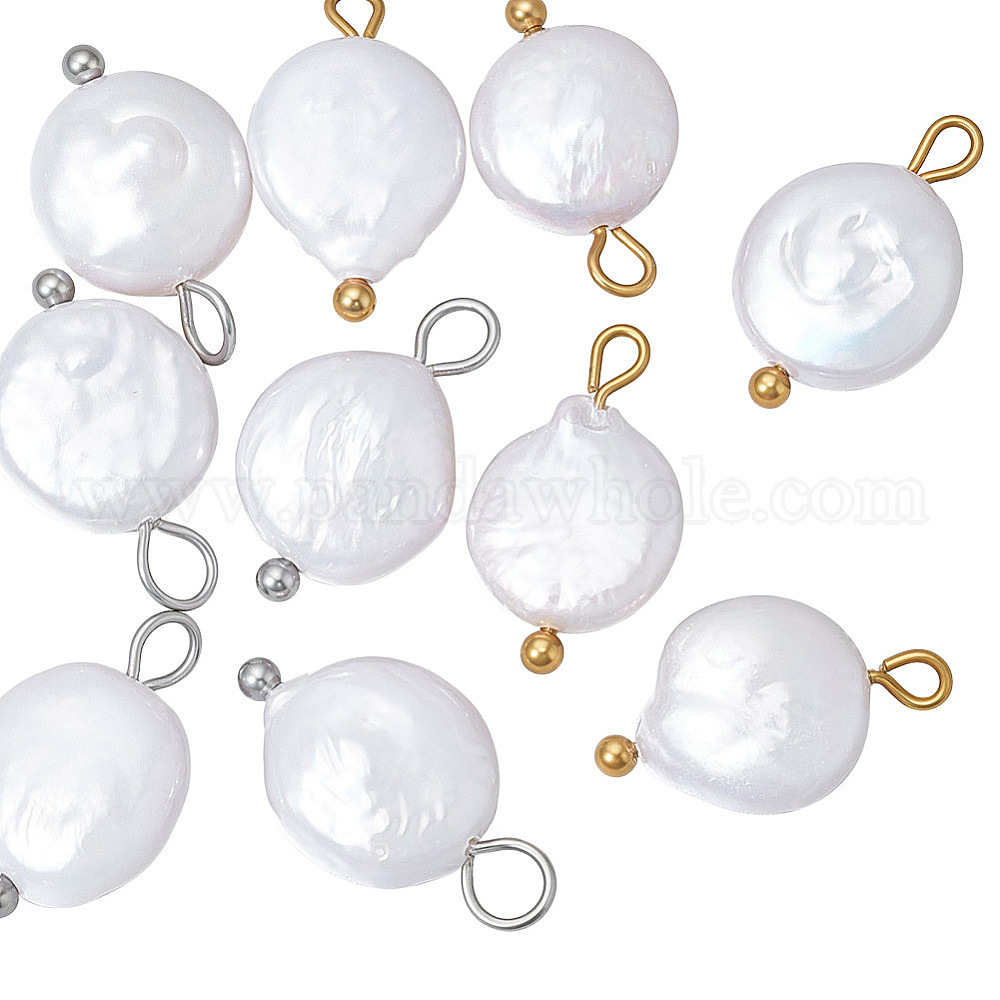 10шт. 2 цвета, подвески из натурального пресноводного жемчуга кеши, плоские круглые прелести, с 304 петлями из нержавеющей стали, белые