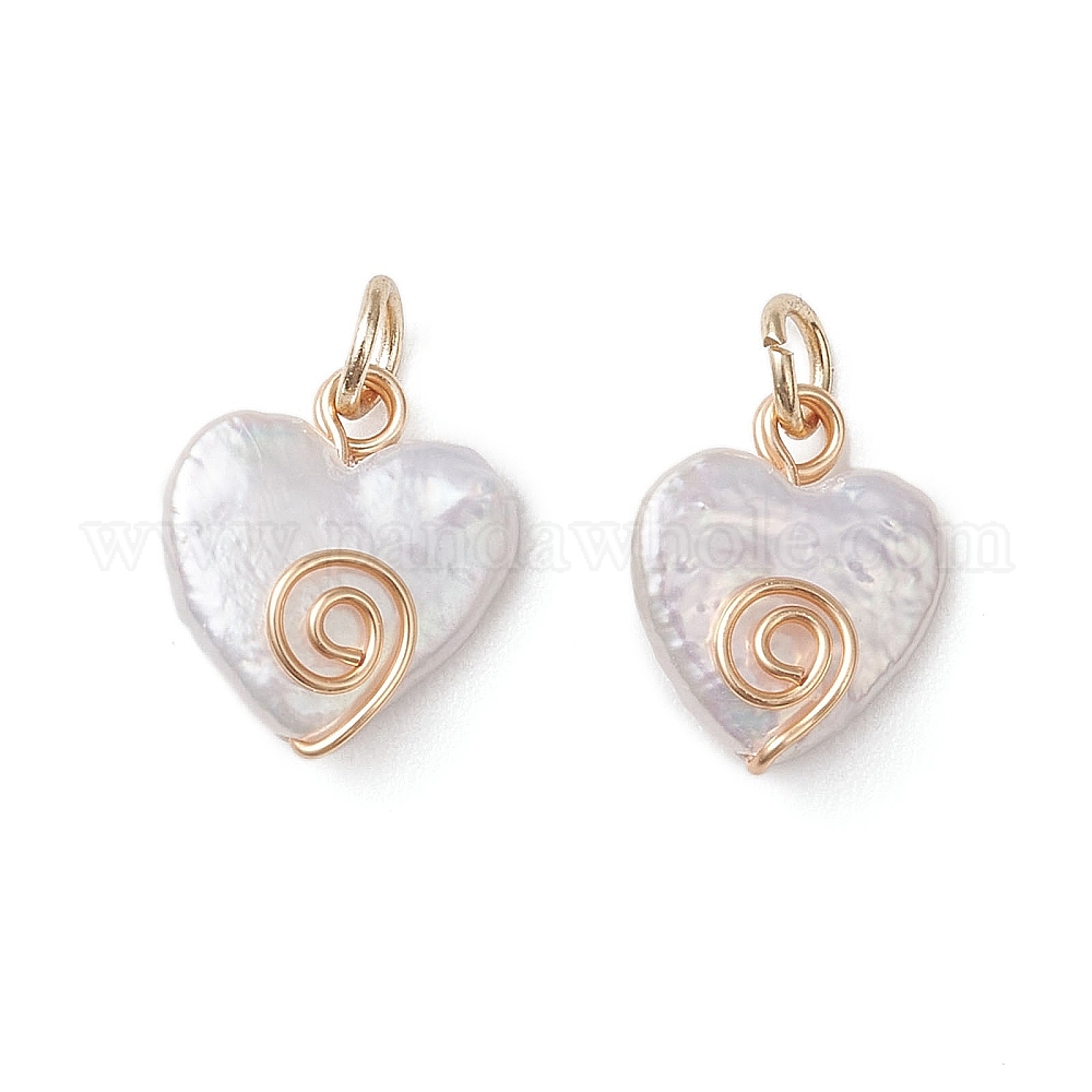 • Золотой Подвески в форме сердца из натурального жемчуга кеши, с обмоткой из экологически чистой медной проволоки, белые, золотые, 13~13.5x10.5~13x4~4.5 мм, Перейти кольцо: 4.6x0.8 мм, внутренний диаметр: 3.5 мм