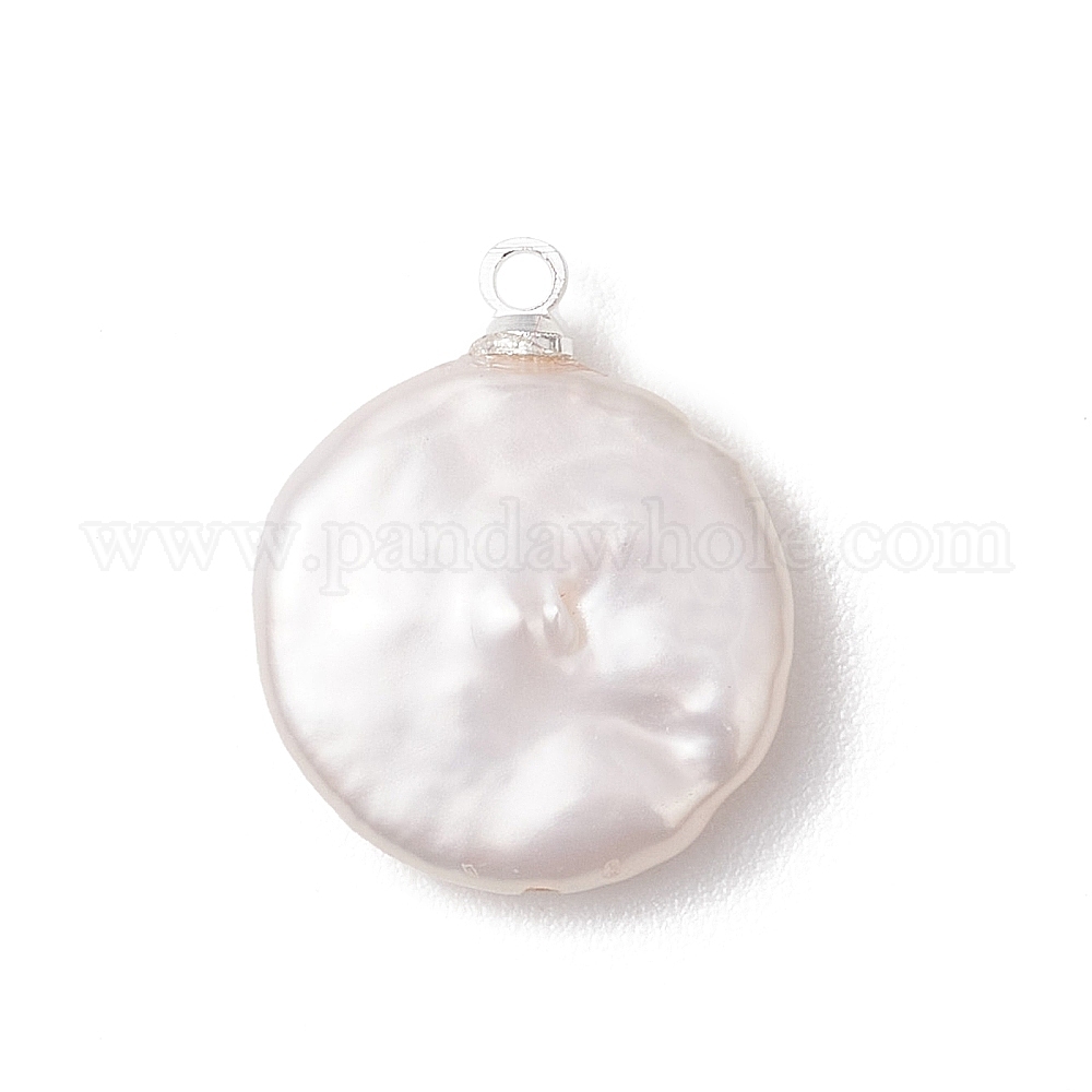 • Серебро Натуральные кеши жемчужные подвески, плоские круглые прелести, с латунной поручительств, белые, серебряные, 18.5x15.5x5 мм, отверстие : 1.6 мм