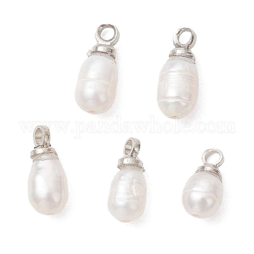 • Платина Натуральные культивированные пресноводные жемчужные рисовые подвески, с латунной поручительств, белые, платина, 9.5~10.5x4~4.5 мм, отверстие : 1.4~1.6 мм
