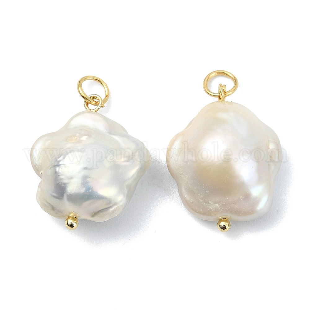 • Золотой Подвески из натурального барочного жемчуга кеши, Подвески в виде цветка сливовой грудины с латунными петлями, цветочный белый, золотые, 20~21x16.5~17x8.5~9 мм, Перейти кольцо: 5x0.8 мм, внутренний диаметр: 3.5 мм