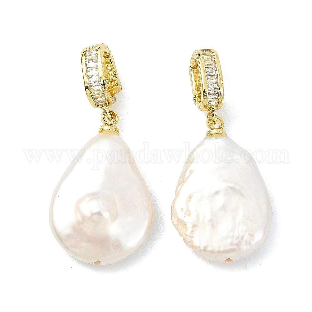 Подвески из натурального барочного жемчуга кеши, Подвески в форме капли с латунными микропаве из прозрачных кубических цирконий в качестве застежек., белые