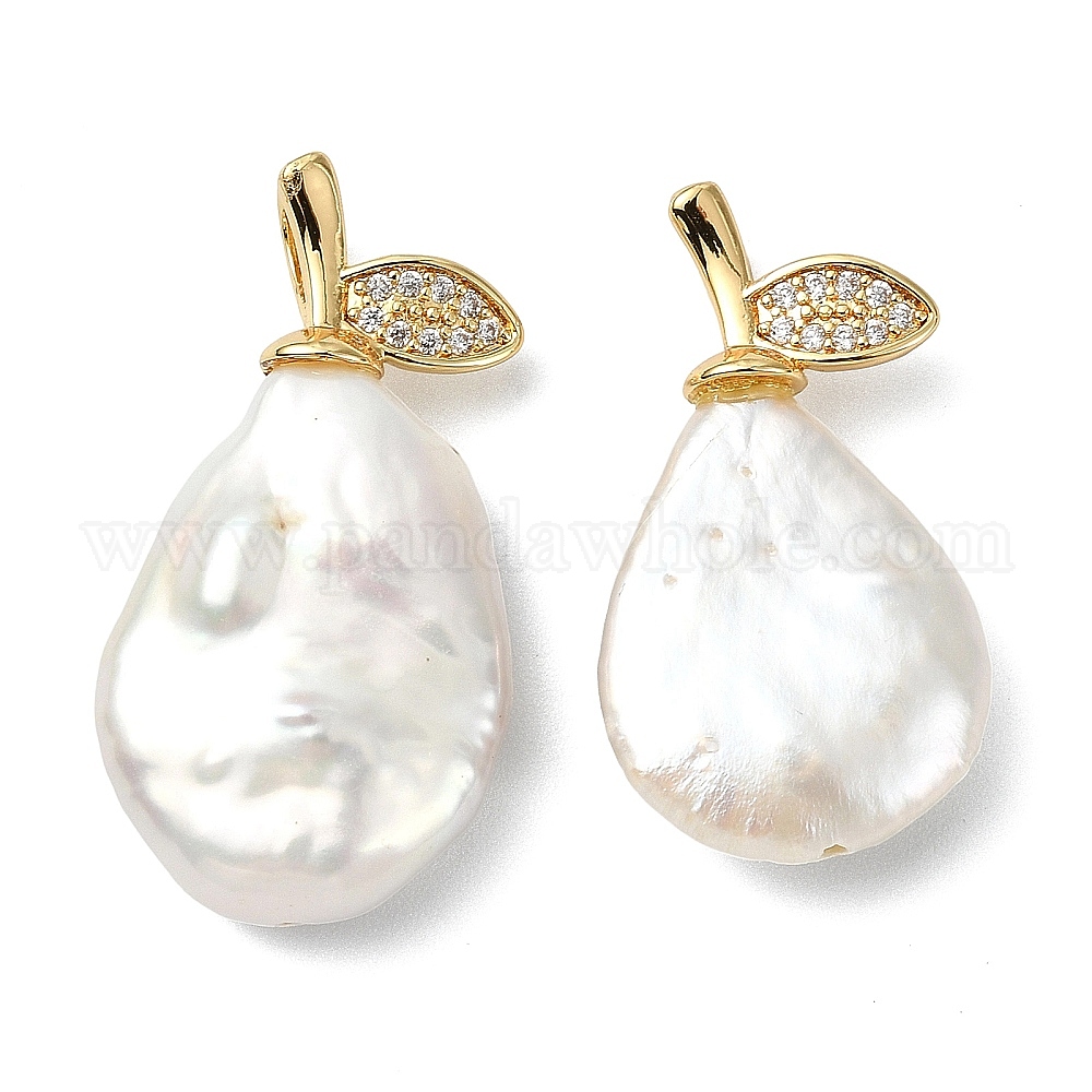Барочные подвески из натурального жемчуга кеши, слезинки, с латунными микропаве и прозрачными фианитами в форме листа, зажимами для крепления., белые