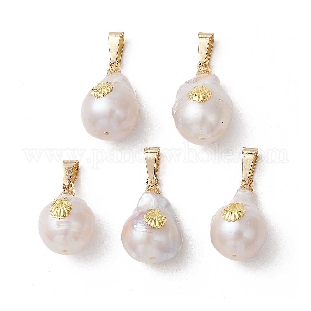 Подвески из натурального барочного жемчуга кеши, Подвески в форме капли с огранкой из сплава ракушек и 304 защелкивающимися креплениями из нержавеющей стали., цветочный белый