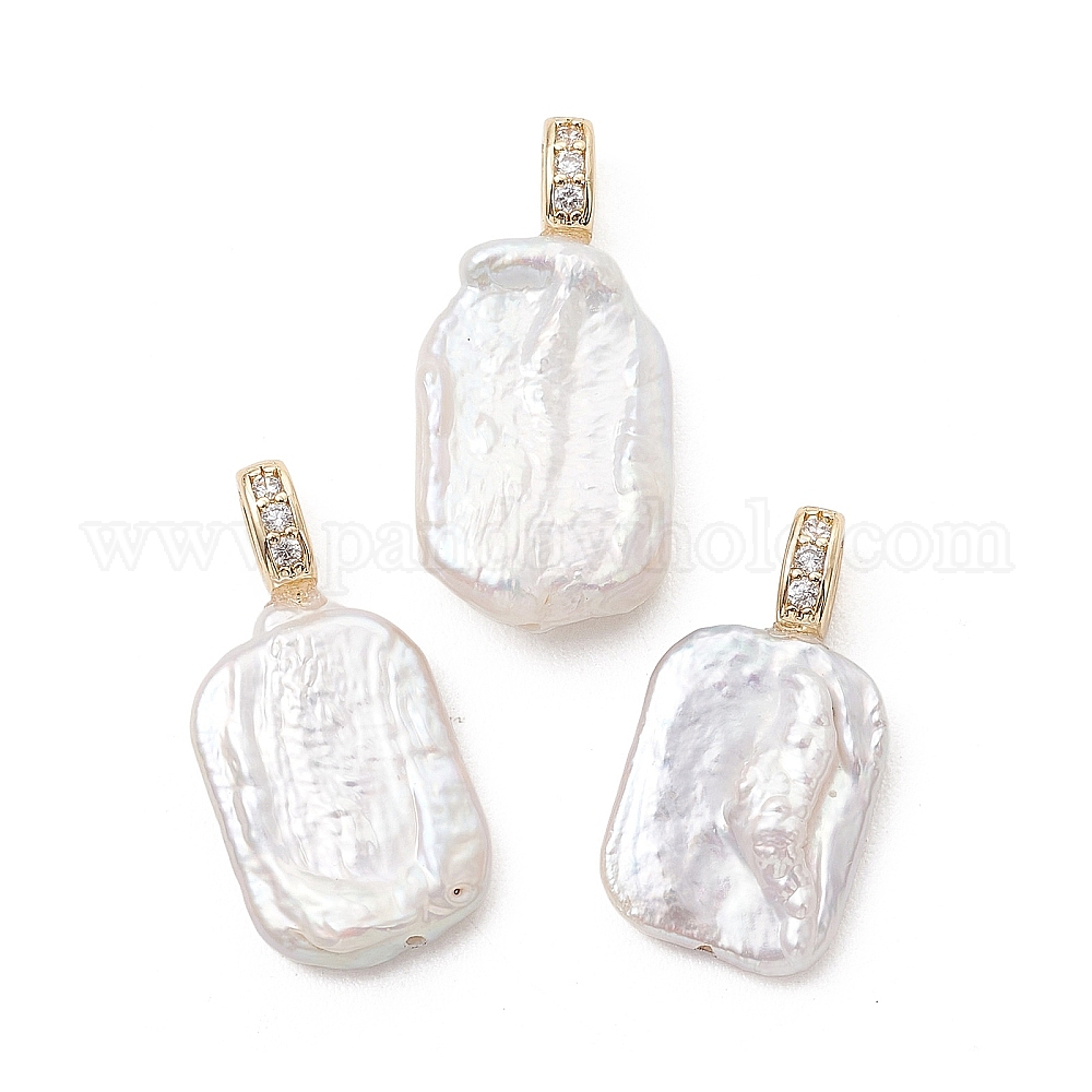 Подвески из натурального барочного жемчуга кеши, Прямоугольные подвески с латунными микропаве из прозрачных кубических цирконий в качестве застежек., белые (03BAD1)