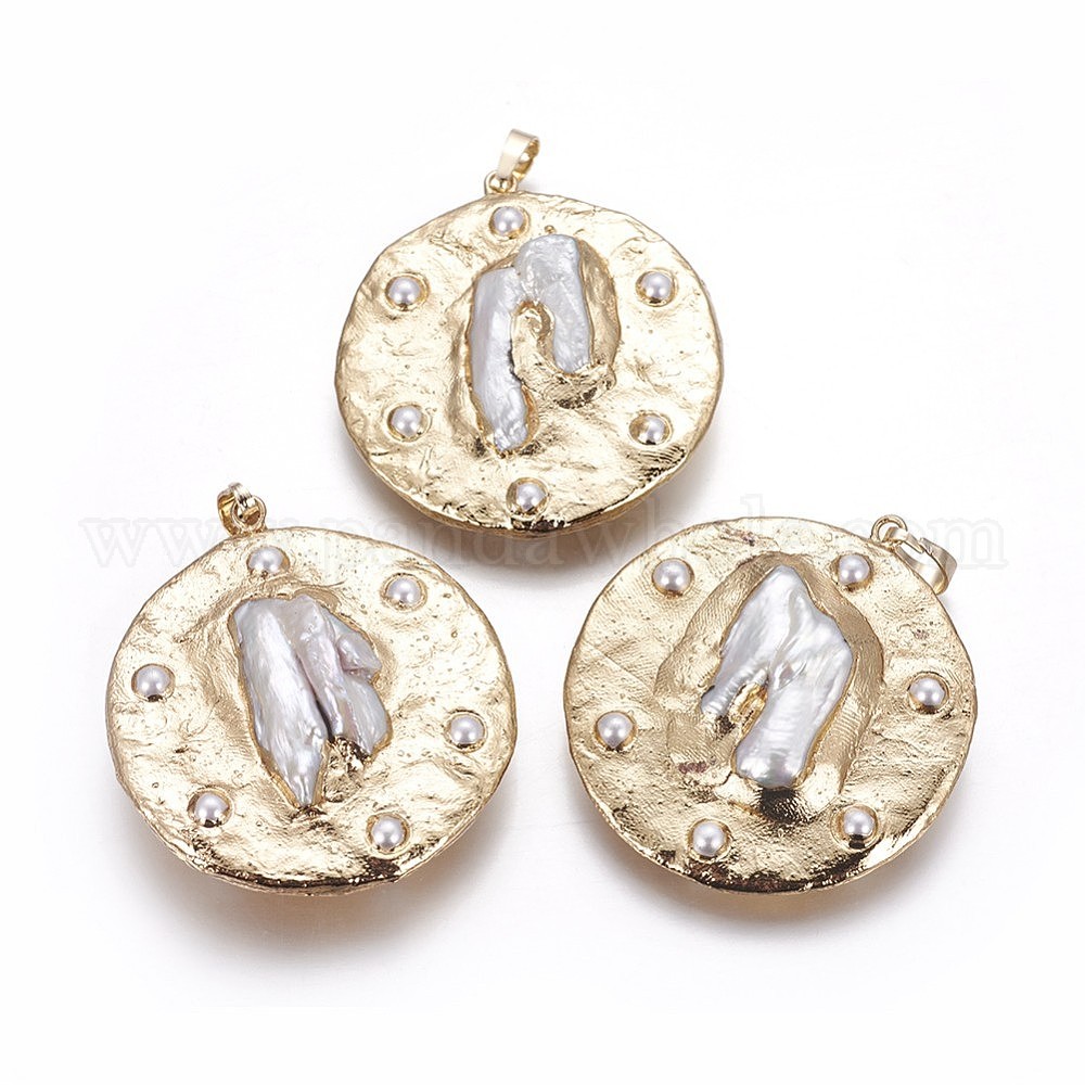 • Золотой Подвески с гальваническим покрытием из натурального пресноводного жемчуга, с стеклянными бусинами и латунной фурнитурой, плоско-круглые, золотые, 44.5~46x41x10.5~12 мм, отверстие : 5x8 мм
