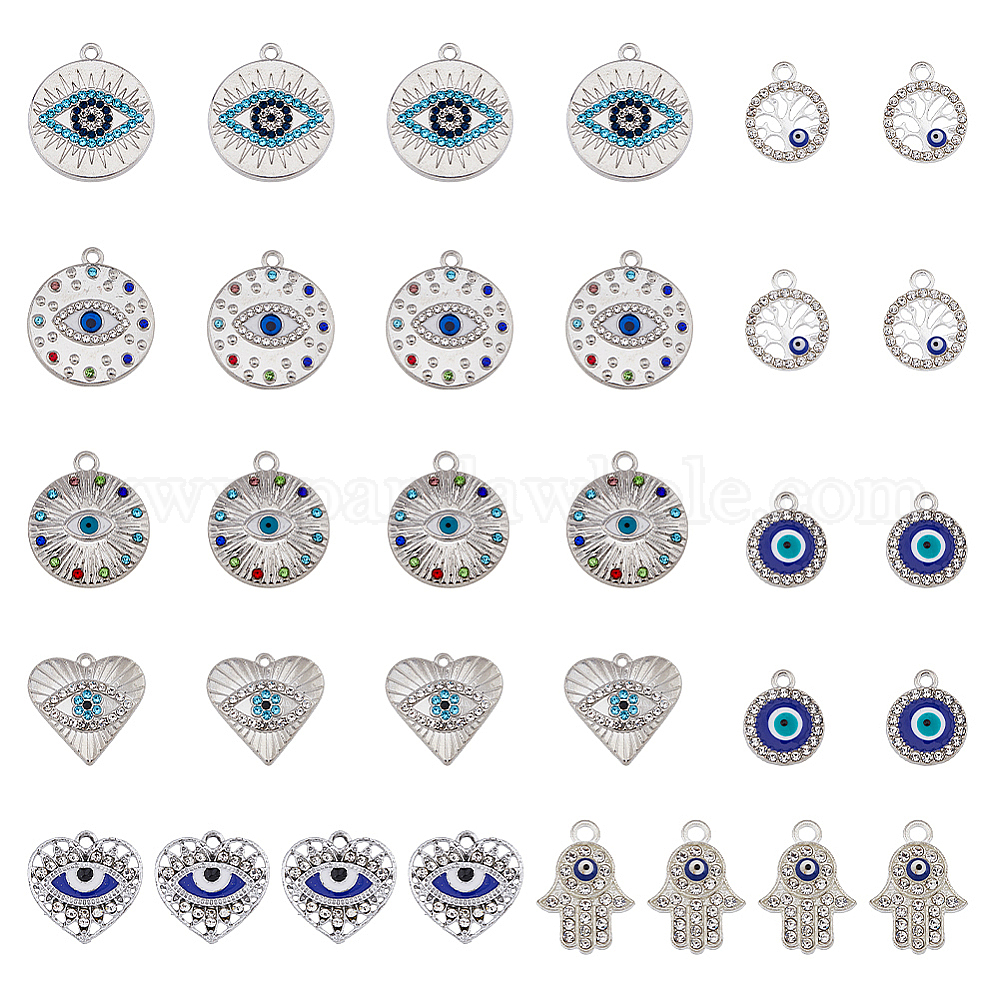 32шт 8 подвески из сплава с эмалью в стиле сглаза, со стразами, Подвески в виде сердца, плоской круглой формы и хамсы для рук и деревьев