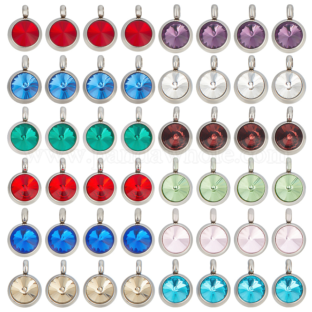 48 шт 12 цвета 304 подвески из нержавеющей стали со стразами, плоские круглые подвески в цвете камня (02NYKR)