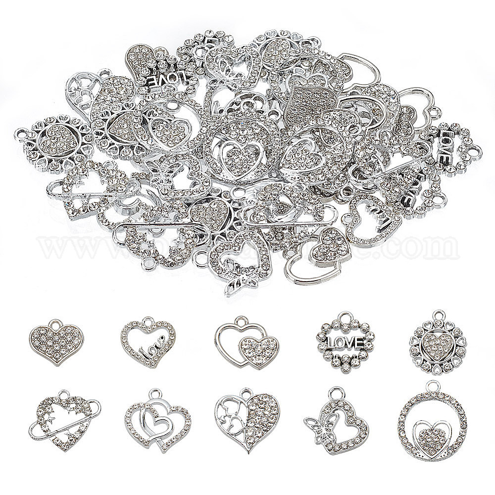 40шт 10 стили подвески со стразами из сплава, платиновый оттенок, Пустое сердце очаровывает любовь