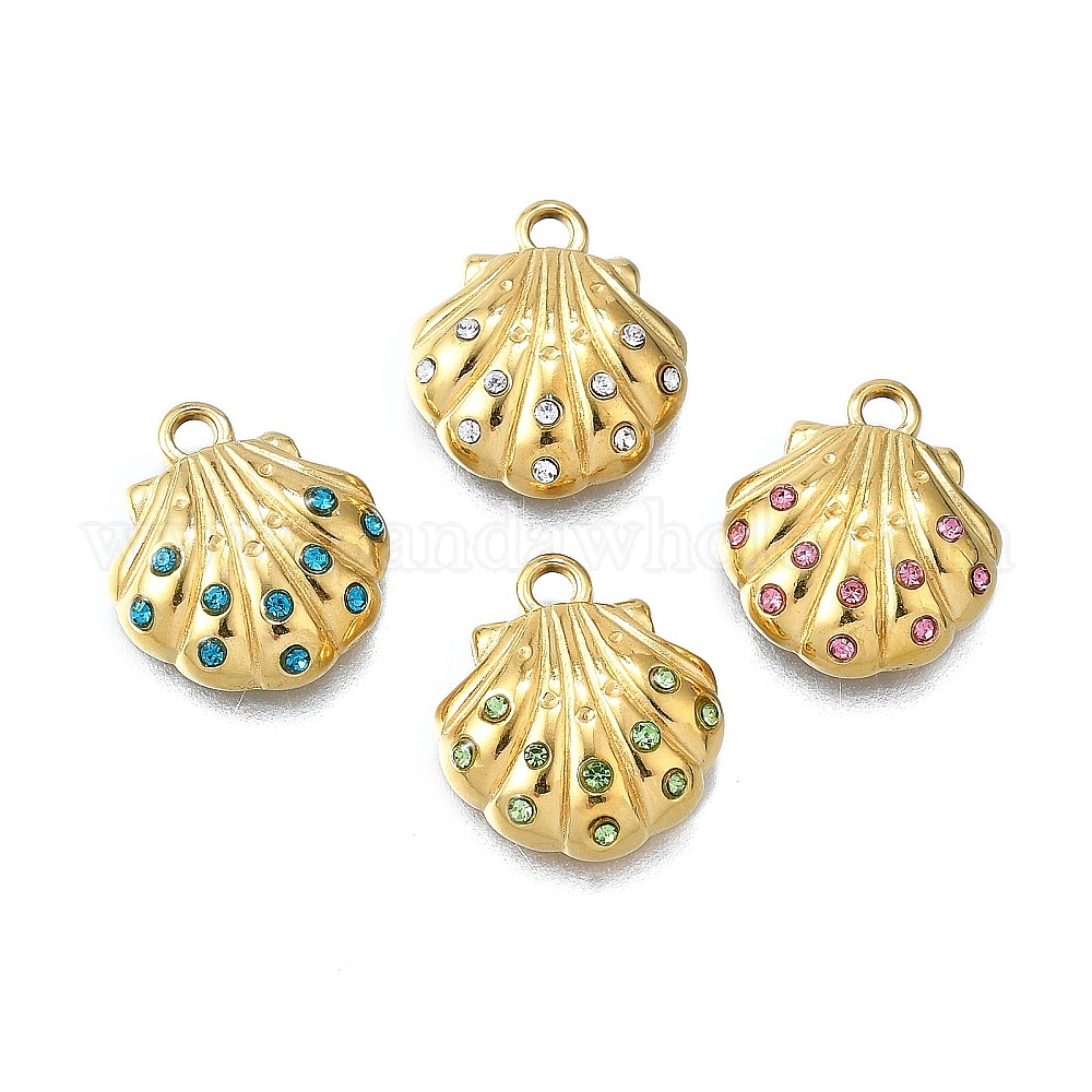 • Кристалл 304 кулон из нержавеющей стали, со стразами, ионное покрытие (ip), формы раковины, реальный 14 k позолоченный, кристалл, 14x12.5x3.5 мм, отверстие : 1.5 мм