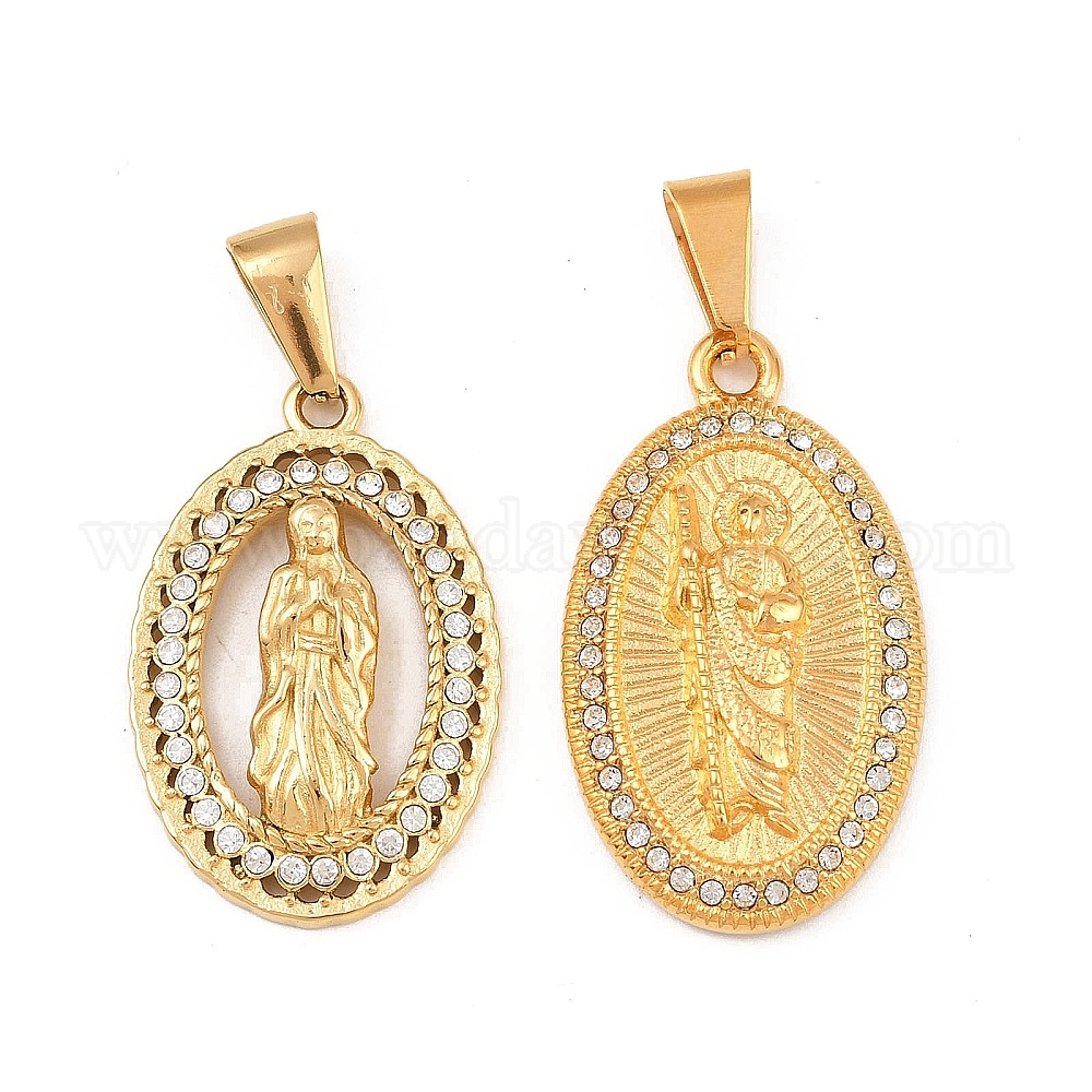 • Настоящее золото 18K 304 из нержавеющей стали с горный хрусталь подвески, овал с подвесками Девы Марии, ионное покрытие (ip), реальный 18 k позолоченный, 31x20x5 мм, отверстие : 8x5 мм