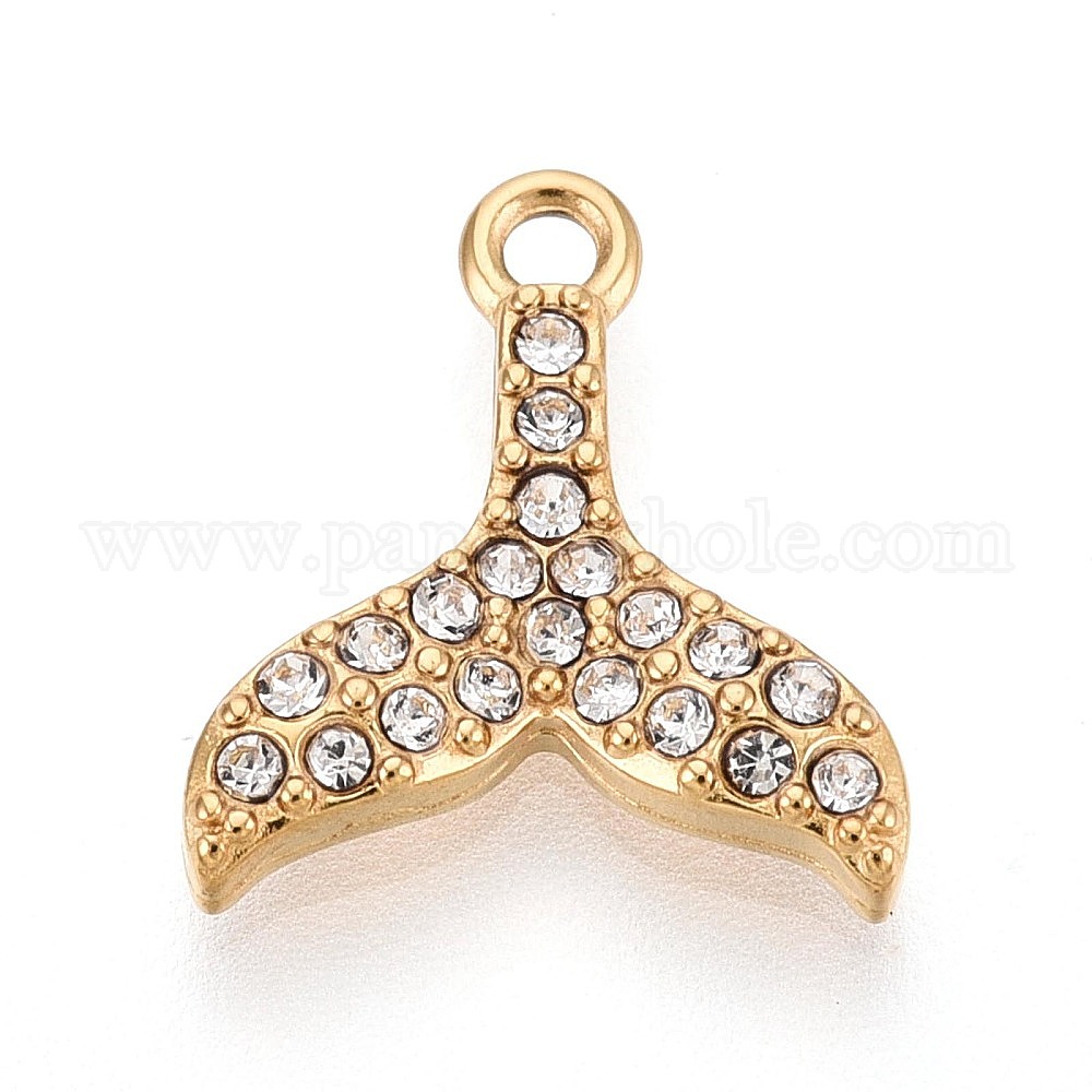 • Золотой 303 подвески из нержавеющей стали, со стразами, прелести рыбий хвост, ионное покрытие (ip), долговечный, золотые, 13x11.5x2.5 мм, отверстие : 1.4 мм