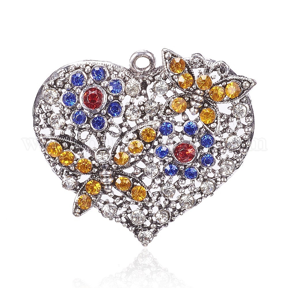 • Разноцветный Сплав горный хрусталь сердце кулоны, с бабочкой, античное серебро, красочный, 48x49x3 мм, отверстие : 5 мм