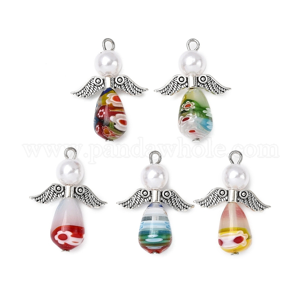 Стеклянные подвески миллефиори, ангел, с крылом из сплава и бусинами из АБС-пластика, имитирующими жемчуг, и железной петлей