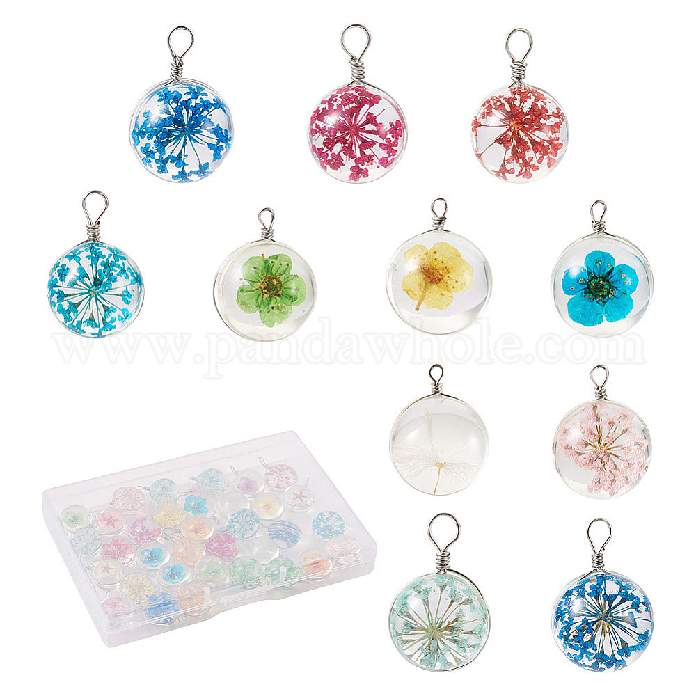 30 шт 15 цвета прозрачные стеклянные подвески, с засушенным цветком внутри и фурнитурой из нержавеющей стали, плоско-круглые