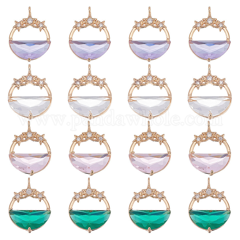 16 шт 4 цвета стеклянные подвески, с латунными микро проложить кубических выводы циркония, граненые, плоские круглые со звездой, золотой свет