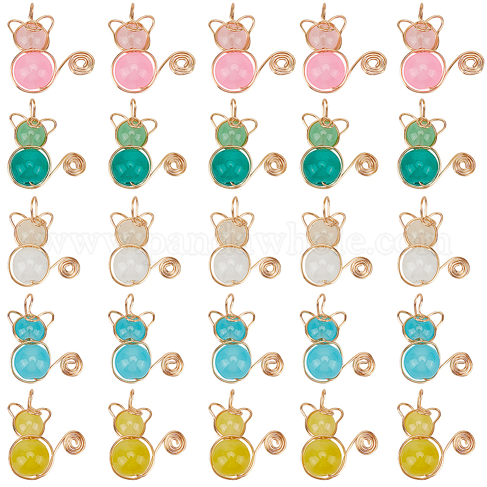 40шт 5 цвета имитация нефрита стеклянные бусины подвески, со светло-золотой медной проволокой, подвески в форме кошки