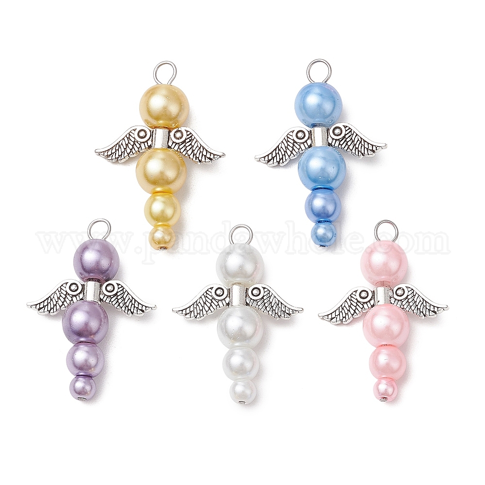 Подвески из перламутровых стеклянных бусин, ангел, с крыльями из сплава и медной проволокой