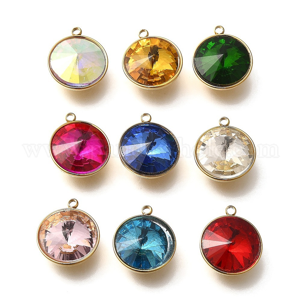 Стеклянные подвески, плоские круглые прелести, с 304 фурнитурой из нержавеющей стали, ионное покрытие (ip), граненые, реальный 18 k позолоченный
