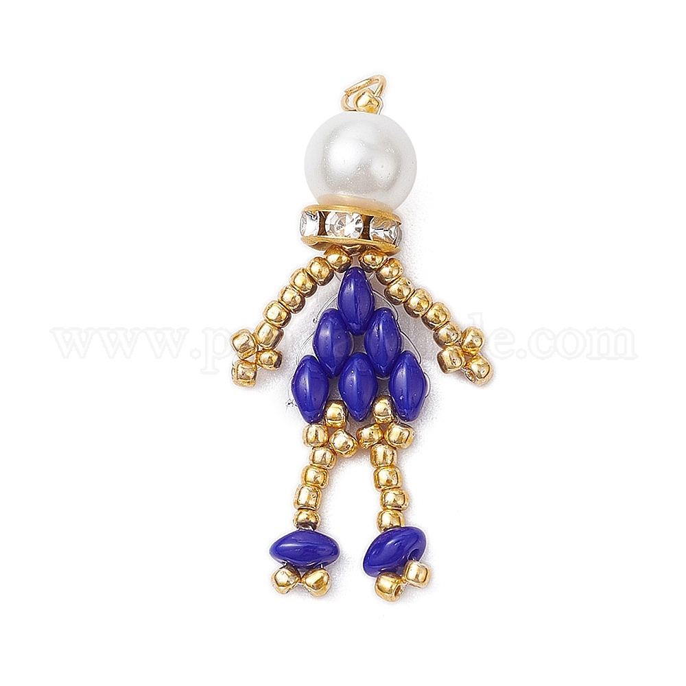• Синий Подвески в виде человека из стеклянных бус, с круглой стеклянной жемчужиной и 304 соединительными кольцами из нержавеющей стали, синие, 36x18x8 мм, отверстие : 2.5 мм