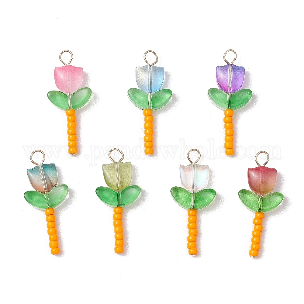 Стеклянные подвески, цветок, с 304 штифтами из нержавеющей стали с плоской головкой и бисером, cmешанных цветов