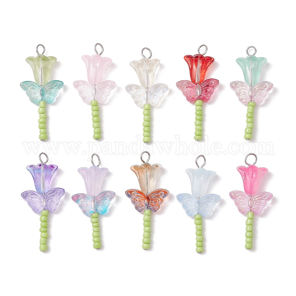 Стеклянные преданты, цветок с бабочкой, с 304 штифтами из нержавеющей стали с плоской головкой и бисером, cmешанных цветов