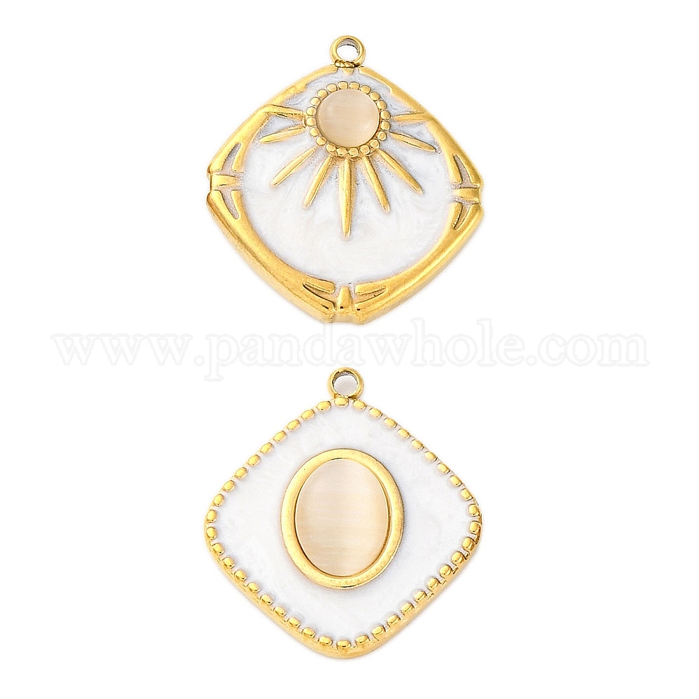 304 подвески из нержавеющей стали, ромб, со стеклом, имитирующим кошачий глаз, и эмалью, ионное покрытие (ip), реальный 18 k позолоченный