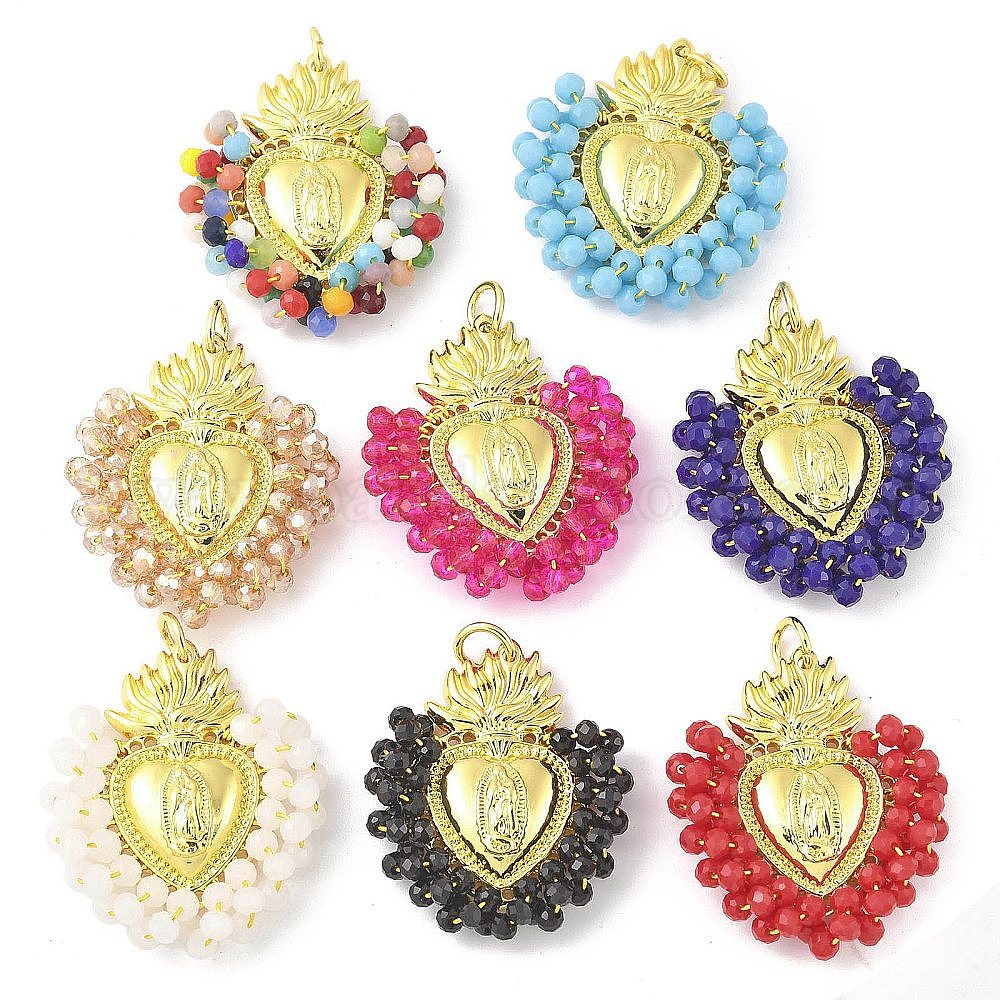 • Разноцветный Латунь стекло кулоны, Сердце с Девой Марией, с петлей, долговечный, без кадмия и без свинца, стойки покрытие, реальный 18 k позолоченный, граненые, красочный, 35.5x30.5x8 мм, отверстие : 5.6 мм