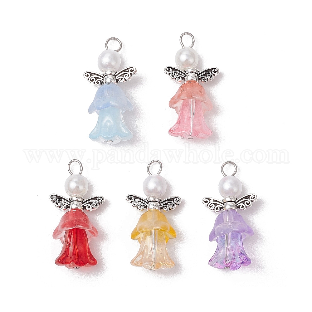 Прозрачные стеклянные бусины с круглыми бусинами из АБС-пластика, имитирующими жемчуг, и бусины в виде крыльев феи из сплава в тибетском стиле, а также 304 подвески с плоскими головками из нержавеющей стали, цветок