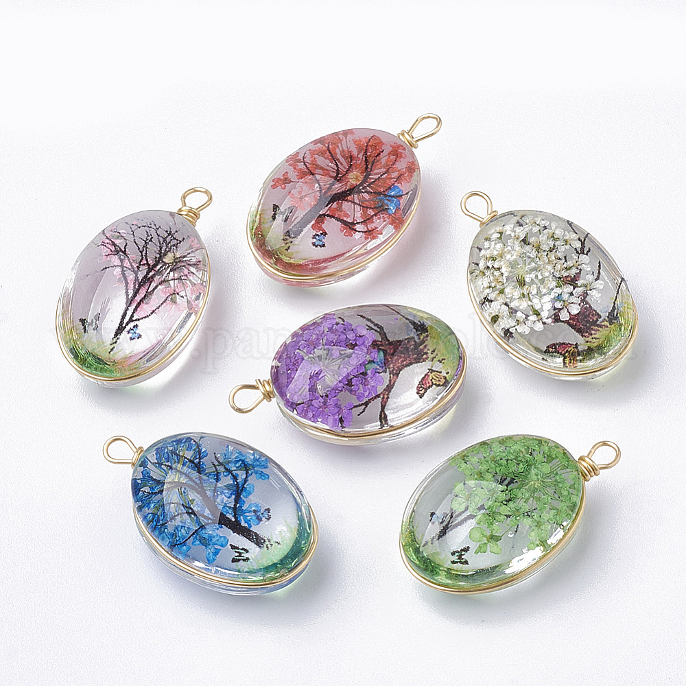 Стеклянные подвески, с высушенными цветами внутри и латуни, овальные, золотые