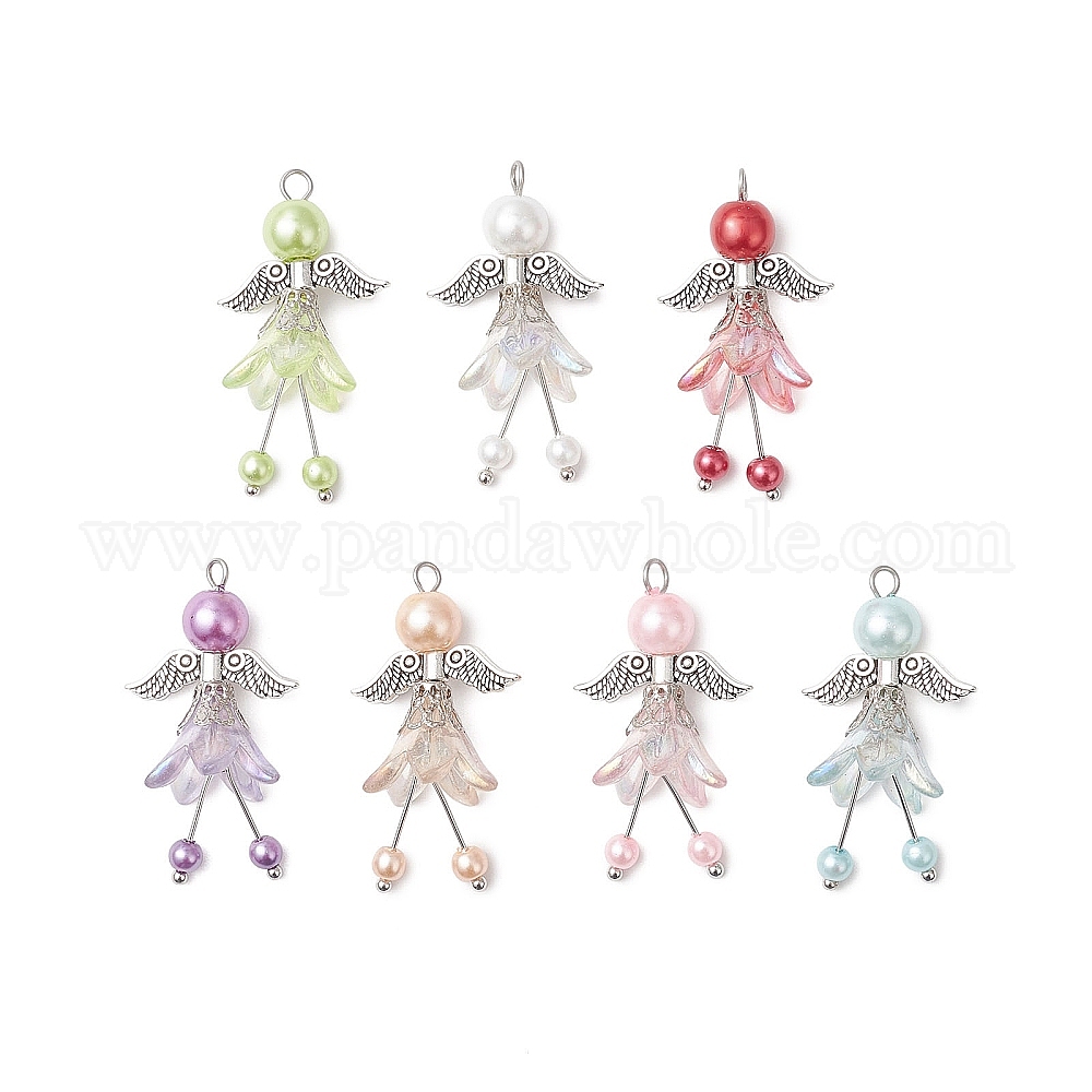 7 шт. 7 цвета стеклянные подвески с жемчугом, ангел, с крылом из сплава и 304 петлей из нержавеющей стали и акрилом
