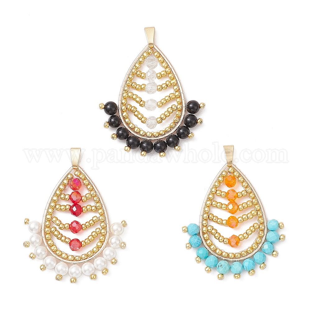 3шт 3цвета стеклянные бусины лист подвески, с натуральным черным ониксом, говлитом, бусинами из ракушечного жемчуга, латунными соединительными кольцами и 304 петлей из нержавеющей стали, граненые