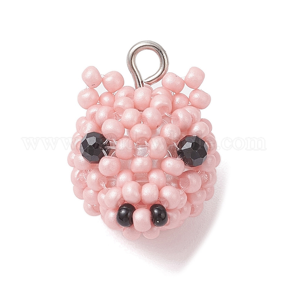 Подвески в виде свиньи из стеклянного бисера, с натуральной черной шпинелью и круглой бусиной из окрашенного в массе стекла и железной петлей