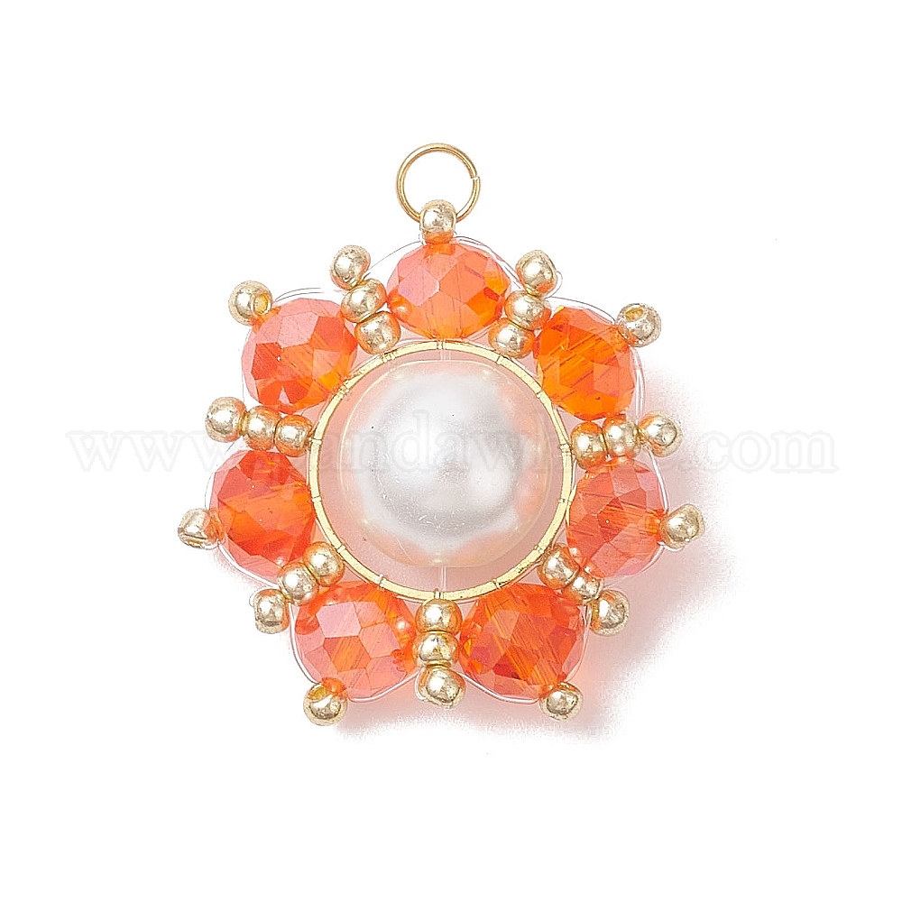 • Оранжевый Стеклянные подвески, подсолнечник, со стеклянными жемчужными бусинами и 304 петлями из нержавеющей стали, граненые, оранжевые, 24.5x24.5x10 мм, отверстие : 3 мм