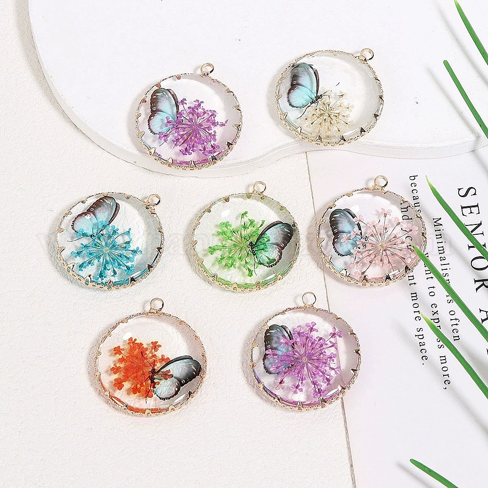 Латунь стекло кулоны, плоский круг с рисунком из сухоцветов и бабочек, золотые