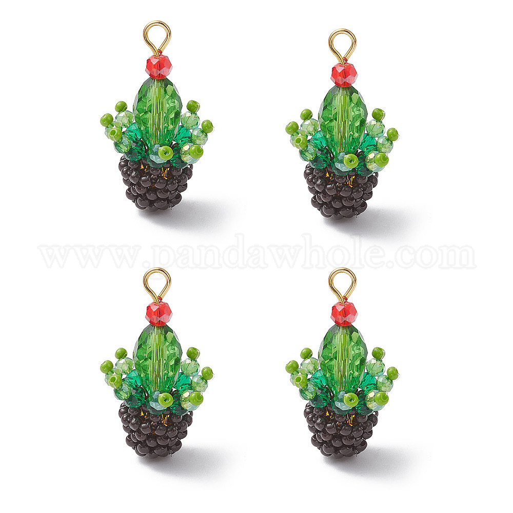 • Зеленый Подвески в виде кактусов из стеклянных бус, с железными петлями и стеклом, золотые, зелёные, 30.5x17.5x16.5 мм, отверстие : 3 мм