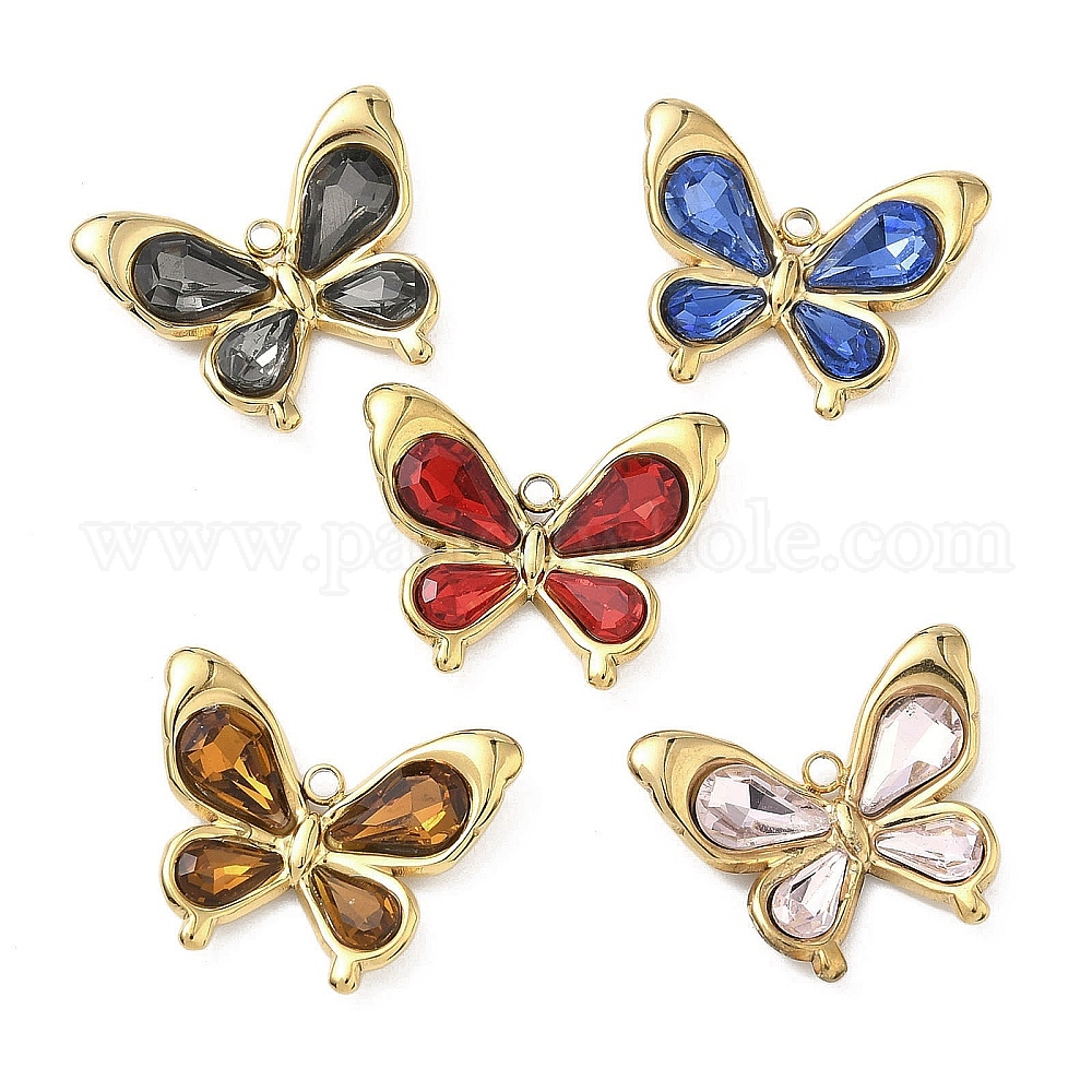 304 подвески из нержавеющей стали и стекла, очарование бабочки, вакуумное покрытие pvd, реальный 18 k позолоченный, граненые