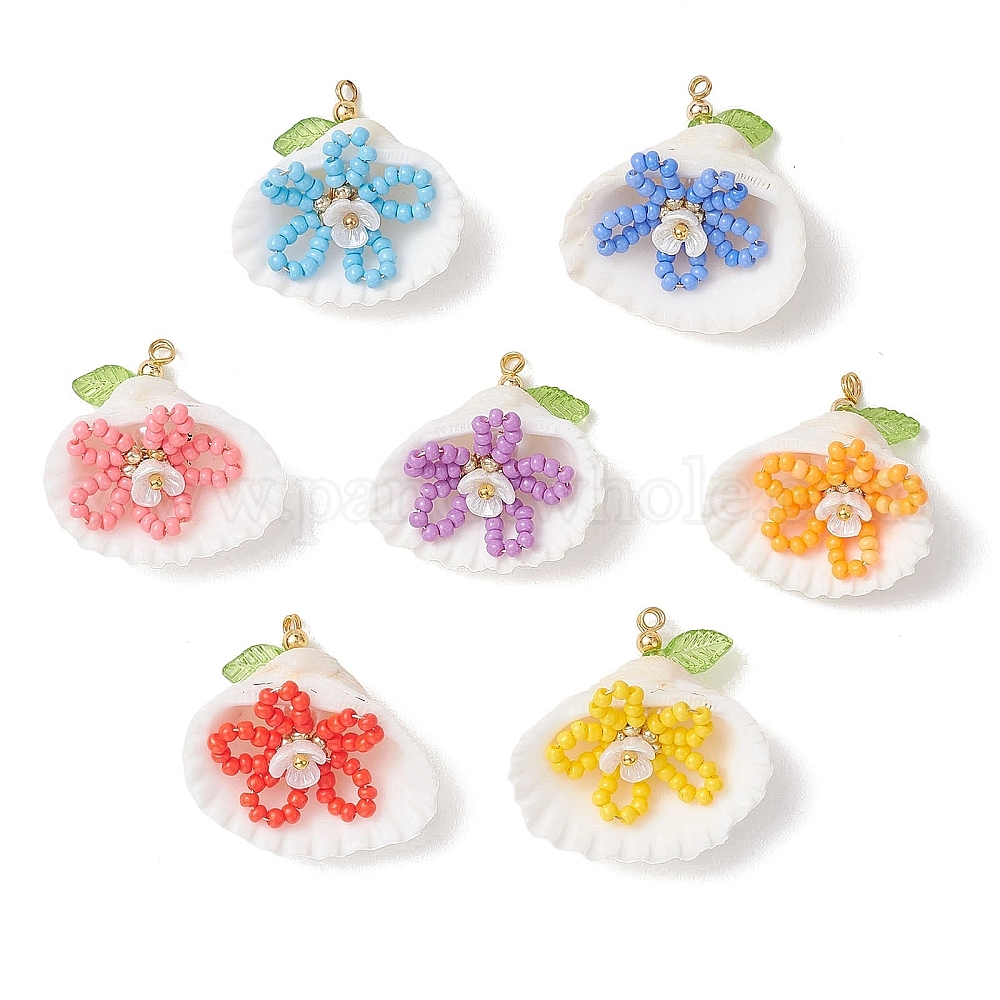 • (52) Непрозрачная лаванда 7 шт. стеклянные бусины-ракушки с подвесками-цветами, с ракушкой, искусственным жемчугом из смолы и медной проволокой, разноцветные, 27.5x26~29x12~14 мм, отверстие : 2 мм