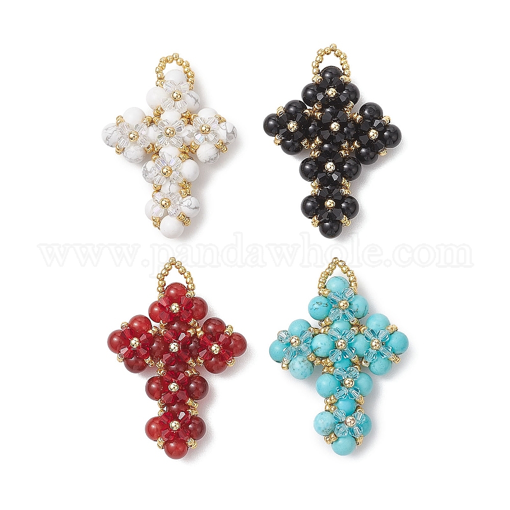 Подвески-крестики из натуральных и синтетических драгоценных камней, круглые бусины и стеклянные бусины, с латунью и стеклом