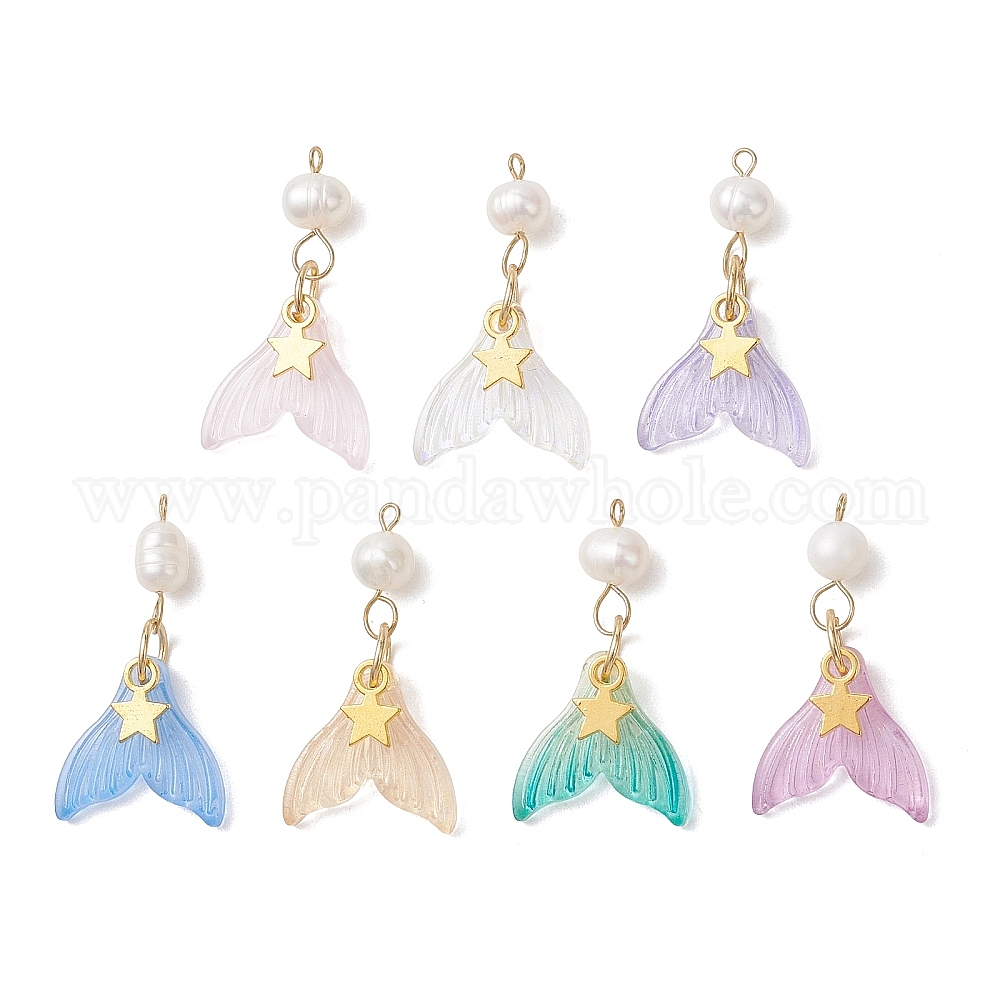 Подвески из стекла, натурального жемчуга и сплавов, окрашенные методом распыления., подвески в виде рыбьего хвоста и звезды, золотые