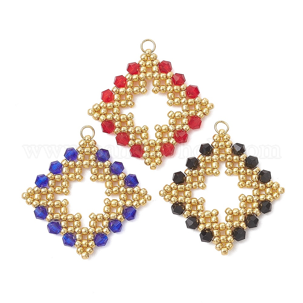 3Подвески из стеклянного бисера, ромбовидный шарм, с 304 нержавеющей сталью и стеклом, реальный 18 k позолоченный, граненые