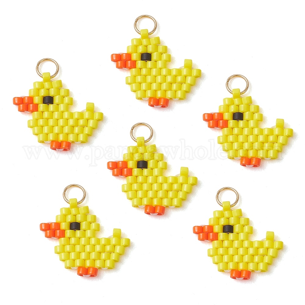 • Желтый Стеклянные подвески из бисера, очарование утки, с открытыми пружинными кольцами из нержавеющей стали 304, реальный 18 k позолоченный, желтые, 14x15x2 мм, отверстие : 3 мм