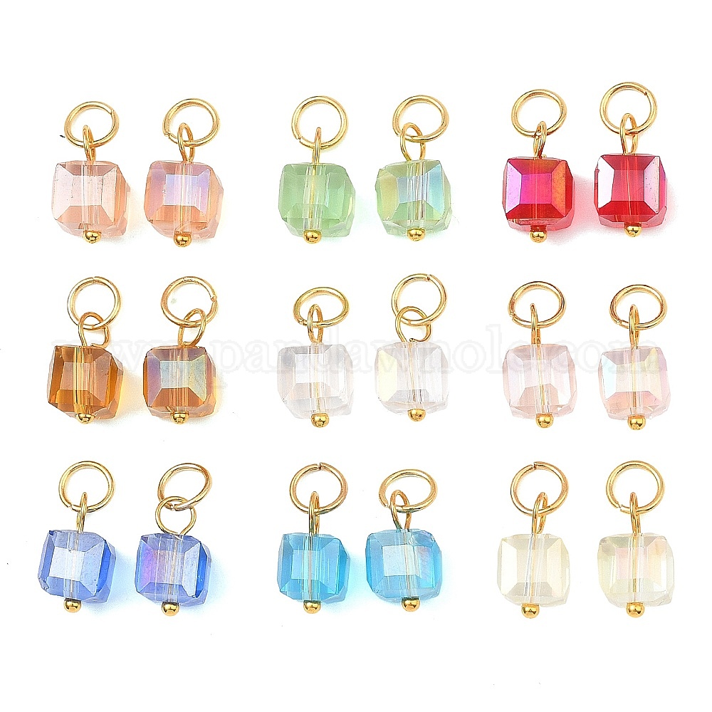 Подвески гальванизируйте стекла, кубический шарм, с открытыми пружинными кольцами из нержавеющей стали 304, реальный 18 k позолоченный, граненые