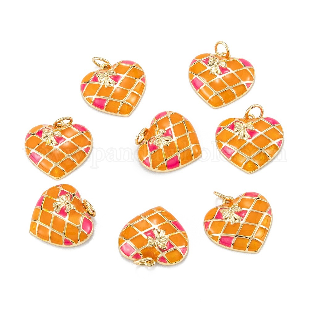 • Настоящее золото 18K Латунь эмаль подвески, с прыжковых колец, долговечный, сердце с сеткой и бантом, оранжево-красный, реальный 18 k позолоченный, 17x18x4.5 мм, отверстие : 3.5 мм