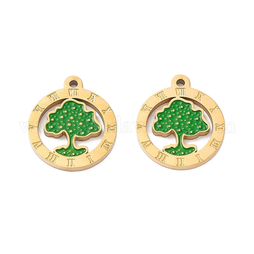 • Настоящее золото 18K Вакуумное покрытие pvd 304 эмалированные подвески из нержавеющей стали, ручная полировка, плоские круглые с деревом, реальный 18 k позолоченный, 17x15x1 мм, отверстие : 1.2 мм