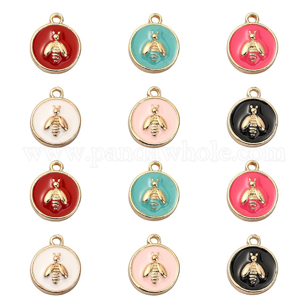 60 шт 6 цвета сплава эмалевые подвески, золотой свет, плоские круглые с пчелой