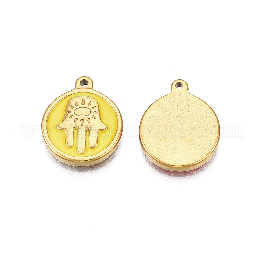 • Желтый 304 нержавеющей стальной эмали подвески, реальный 18 k позолоченный, плоские круглые с Хамса стороны, желтые, 18x15x2.5 мм, отверстие : 1.2 мм